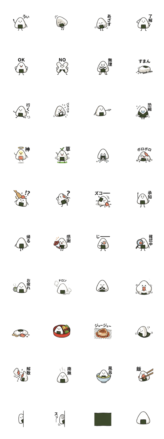| スタンプ説明 | シンプルで使いやすいおむすびのスタンプ。飯テロ、ランチ、日々の返信に。白米好きやシュールな会話に最適。文字が見やすい、無表情なおにぎり。 |