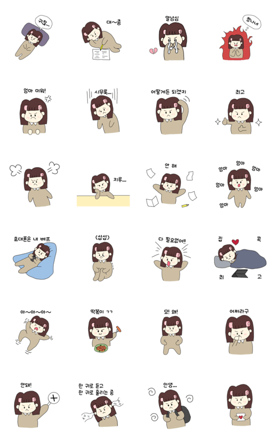| スタンプ説明 | Pink hair roller, sharp eyebrows, and a permanent scowl! Ppyo-jiny is the moody teen who's tired of everything but lives for spicy Tteokbokki. |