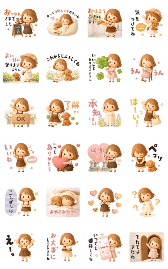 | スタンプ説明 | やさしい女の子とわんちゃんが、気持ちを伝える日常スタンプ。あいさつ・返事・感謝など、ずっと使える言葉を集めました。 |