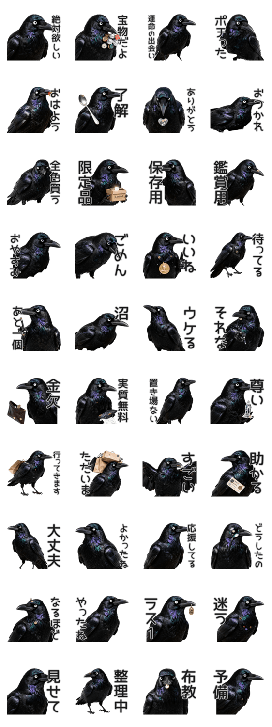| スタンプ説明 | 光る物大好き!収集癖カラス。買い物/推し活/日常/挨拶/鳥/トリ/沼/オタク/大人/面白い/シュール/散財/欲/金 |