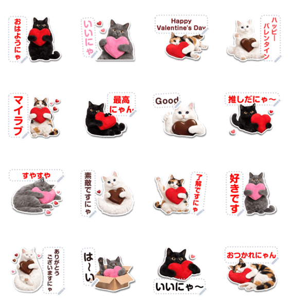 | スタンプ説明 | 自由に文字入力できるにゃ!ハートのチョコやクッションを抱きしめてるにゃんこのメッセージスタンプ❤バレンタインデーやホワイトデーに❤黒猫/白猫/グレー/三毛猫/猫部/恋愛 現在この商品は一部のスマートフォン版LINE 10.3.0以上のトークルームでのみ使用できます。動作環境の最新情報はヘルプをご確認ください。 |