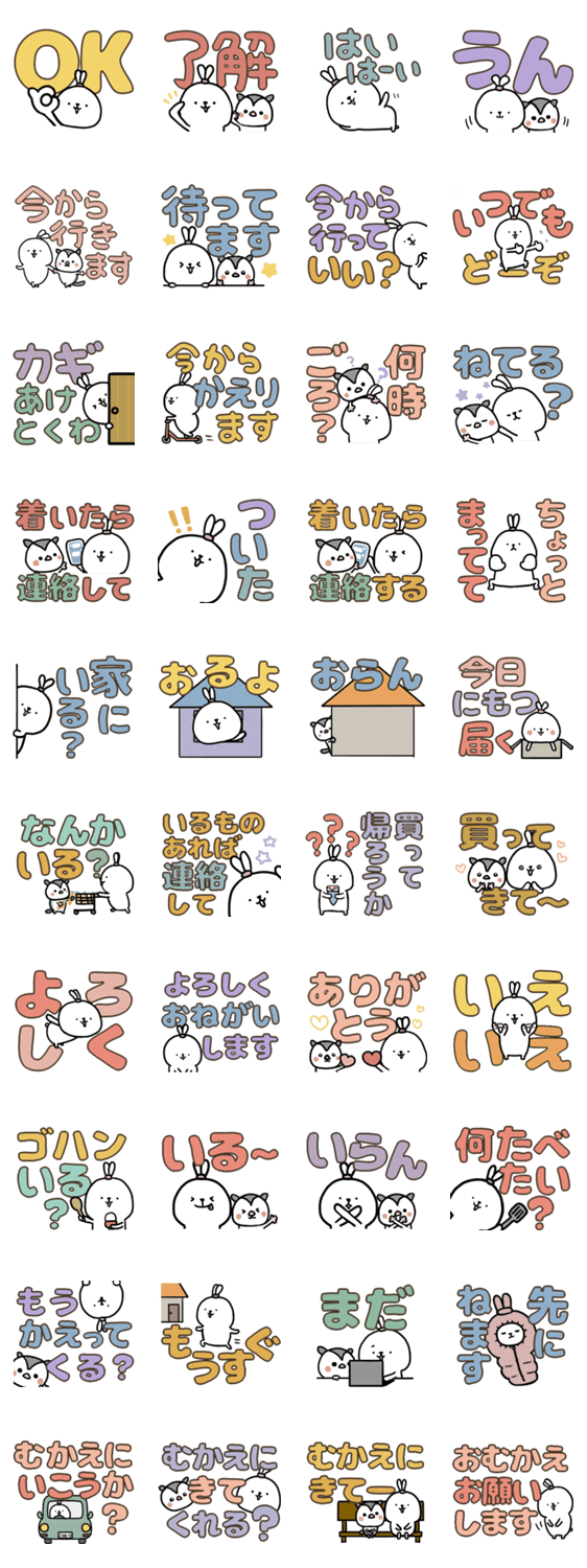 | スタンプ説明 | 毎日使える家族に送るスタンプ。フクロモモンガも登場。うさぎ/日常/夫婦/親子/見やすい/読みやすい/大きい文字/くすみカラー/送り迎え/待ち合わせ/荷物/ごはん/買物/実家 |