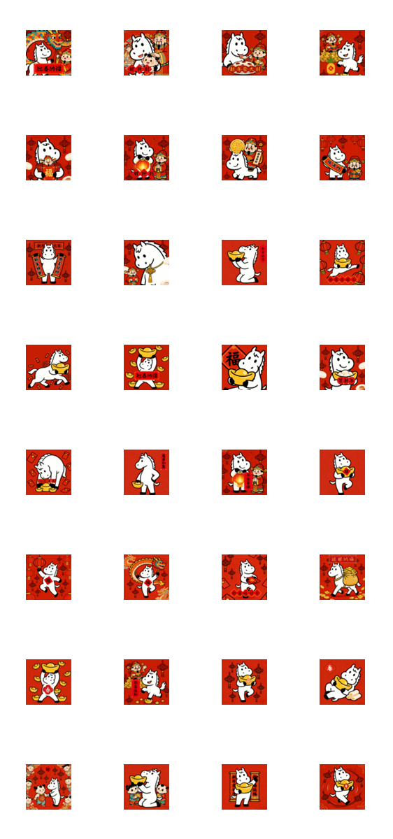お金も福もお祭りも大好きな白い馬が登場! お年玉、元宝、財神が勢ぞろい。 お正月のトークにぴったり、金運アップ間違いなし。