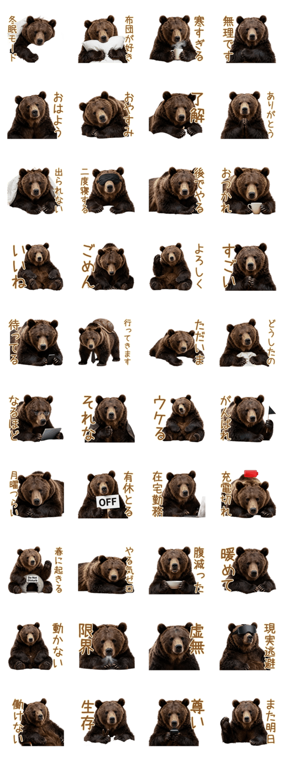 | スタンプ説明 | ずっと寝ていたい「冬眠願望ヒグマ」のスタンプ。働きたくない、布団から出られない、無限に眠い等の限界な気持ちを、シュールなクマが代弁します。 |