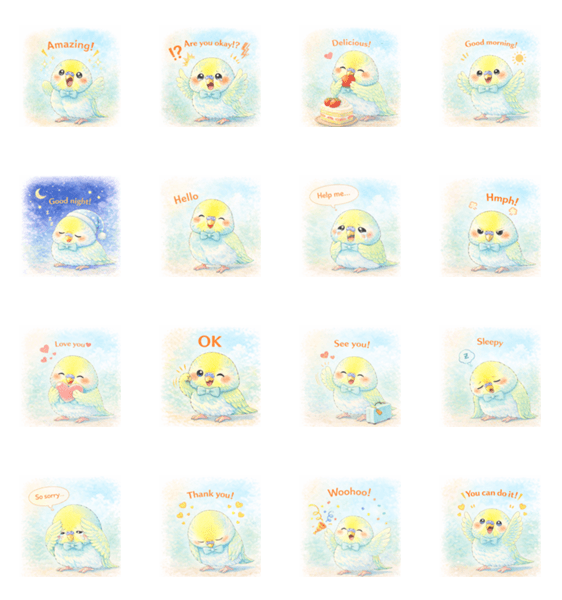 | スタンプ説明 | A sweet watercolor budgie expressing love, joy, worry, and encouragement. Perfect for daily chats, comfort, and warm-hearted messages. |