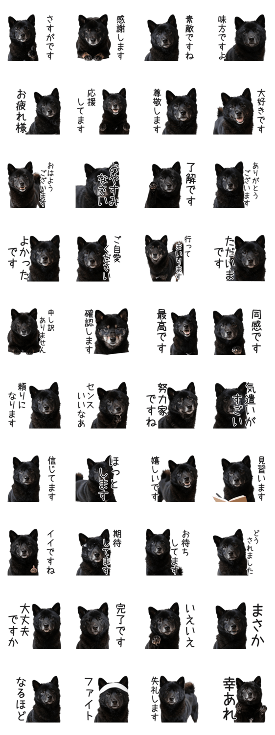 | スタンプ説明 | 大人敬語の黒柴さんが、さりげなく褒めて癒します。仕事や日常の挨拶に毎日使える、丁寧で優しい犬のスタンプです。 |
