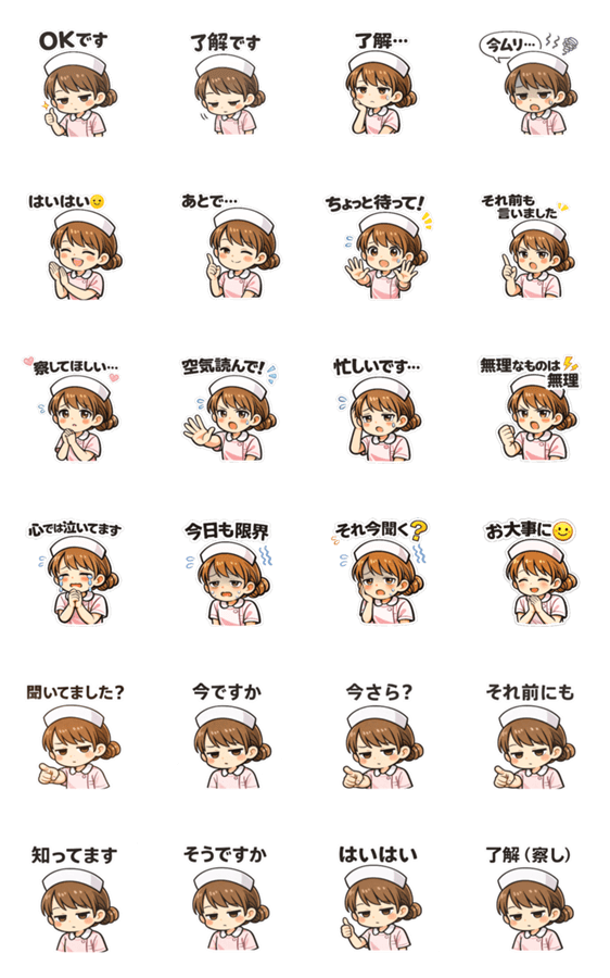 | スタンプ説明 | ちょっと疲れた毎日に使いやすい ちょい毒舌な看護師さんのスタンプです。 「はいはい」「今ムリ」「HPゼロ」など 日常会話や仕事中・仕事終わりに使える40個 |