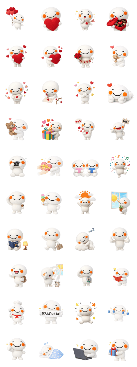 | スタンプ説明 | にっこりゆるいキャラクターが優しさや愛、好きな気持ち相手を思う気持ちを届けます。文字なしで使いやすい◎毎日使える♪ずっと使える♪ #バレンタイン #告白 #好き |