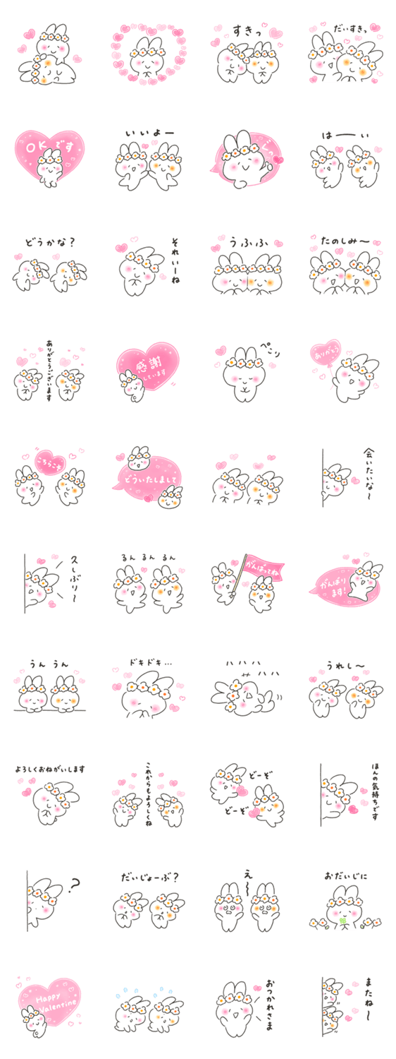 | スタンプ説明 | 毎日使えるかわいいうさぎのスタンプ。友達や大切な人にありがとう、大好きなど、あなたの気持ちを伝えてね♡やさしい言葉もピンクのハートもいっぱい!バレンタインにも♡ |