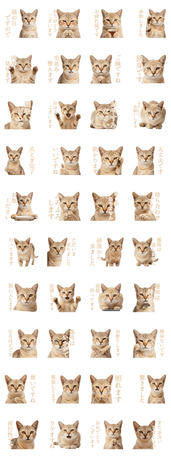 | スタンプ説明 | 婚活中スナネコが主役。出会いを求めるもドライでシュールな挨拶を。恋愛迷走中の心に刺さる、砂漠のように乾いた丁寧語です。猫の日にも最適。 |