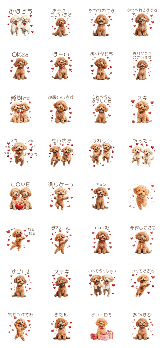 | スタンプ説明 | トイプードルのハートいっぱいスタンプ♡ バレンタイン・ホワイトデーや日々の生活にも使える表現を集めたスタンプです。 |