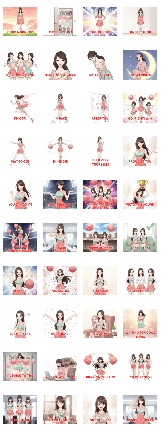 | スタンプ説明 | 気品あふれるチアリーダーが、あなたの日常に輝きを添えます。洗練された動きとエレガントな英語のメッセージで、大切な人をスタイリッシュに励ましましょう。 |