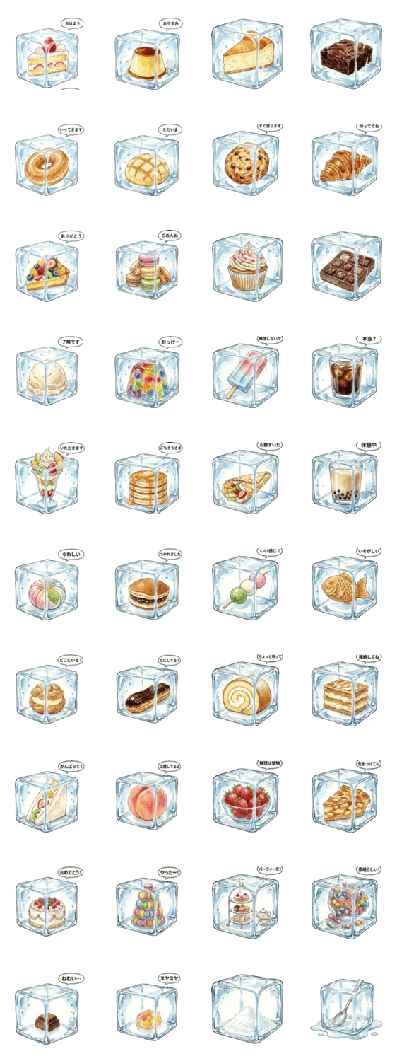 | スタンプ説明 | 透き通る氷にケーキや和菓子を入れた水彩画第7弾。挨拶、敬語、お祝等、毎日使える日常会話。おしゃれで綺麗、リアルなデザートが美味しそう。ショートケーキ |