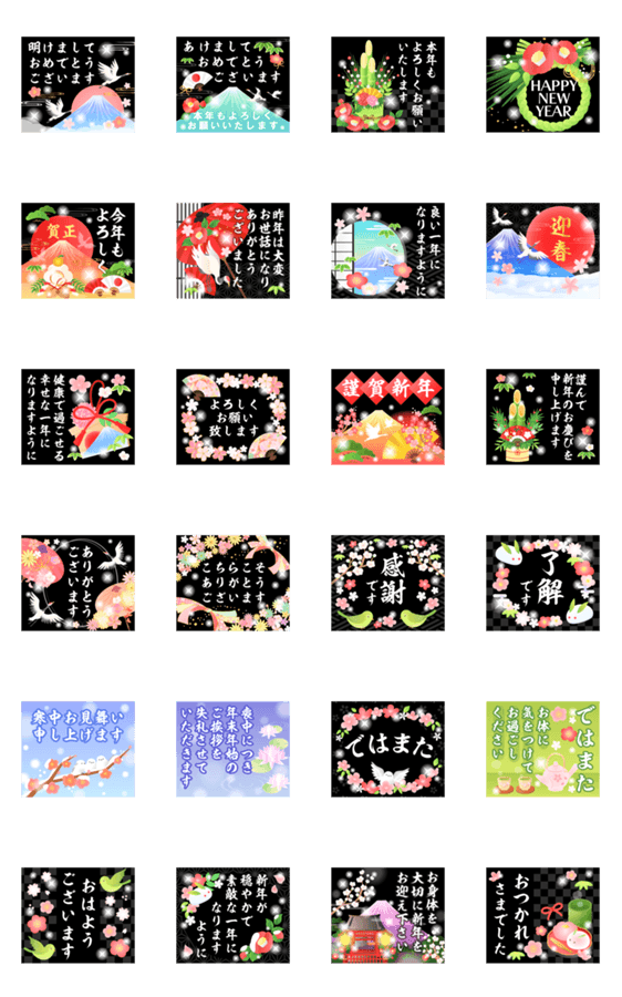 | スタンプ説明 | 長く使えるおとなモダンな年賀スタンプです。あけましておめでとう,お正月,年末年始,新年,あけおめ,大晦日,謹賀新年,年賀状,様々な場面でのご挨拶に使ってください♬ |