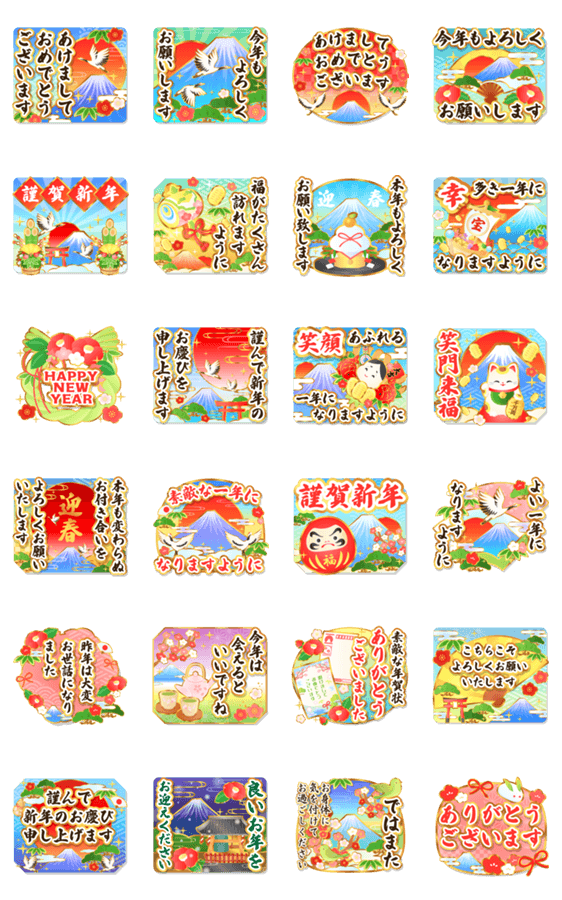 | スタンプ説明 | ずっと使える豪華なお正月スタンプです。あけましておめでとう,お正月,年末年始,新年,あけおめ,大晦日,謹賀新年,年賀状,様々な場面でのご挨拶に使ってください♬ |
