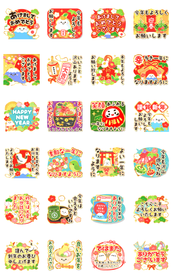 | スタンプ説明 | 豪華に飛び出すずっと使える明るいお正月スタンプ!あけましておめでとう,お正月,年末年始,新年,あけおめ,大晦日,謹賀新年,年賀状,様々な場面でのご挨拶に使ってね♬ |