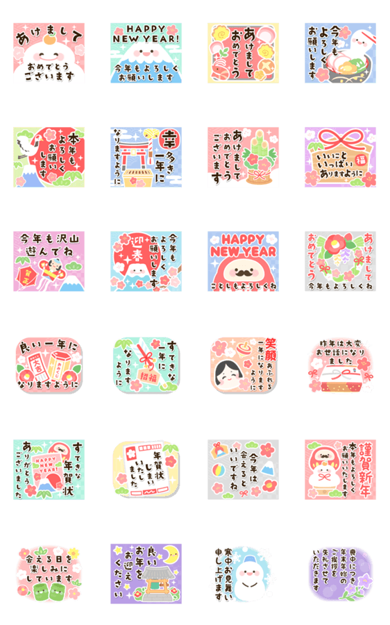 | スタンプ説明 | ずっと使えるかわいいお正月のスタンプです♪あけましておめでとう,お正月,年末年始,新年,あけおめ,年越し,大晦日,謹賀新年,年賀状,様々な場面でのご挨拶に使ってね♬ |