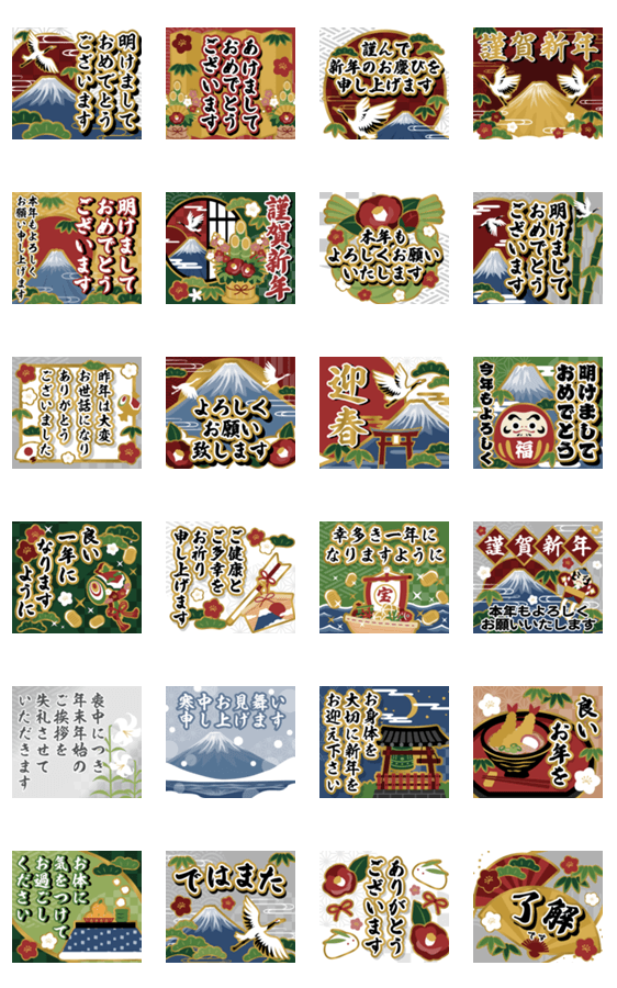 | スタンプ説明 | とびだす!ずっと使える伝統カラーのお正月のスタンプです♪あけましておめでとう,お正月,年末年始,新年,あけおめ,年越し,大晦日,謹賀新年,年賀状,様々な場面でのご挨拶に♬ |