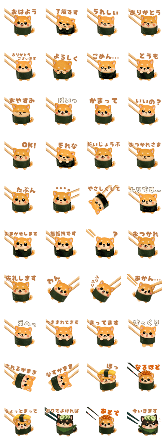 | スタンプ説明 | 寿司になりたい柴犬たちが、 つままれながら、日常の気持ちをそっと代弁してくれる世界です。 |