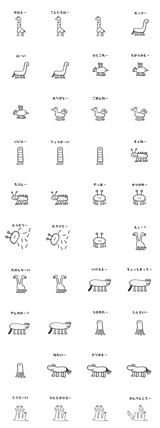 | スタンプ説明 | 意味はよくわからないけど、なんとなく感情は伝わる不思議な生き物たち。 気まずい空気、微妙な反応、無言の感情をシュールに表現します。 |