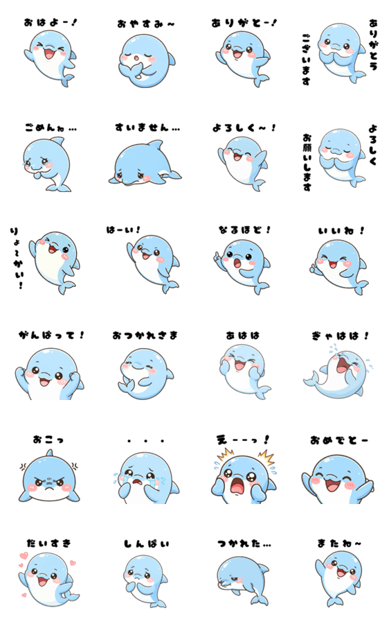 | スタンプ説明 | ゆるっとかわいいイルカが、毎日使えるあいさつをシンプルに伝えます。日常、敬語、丁寧語を用意させて頂きました! ご友人、お仕事等でのトークに是非お使い下さい! |
