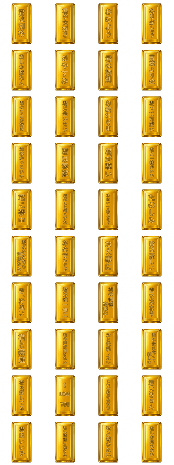 | スタンプ説明 | 金のインゴットで、気持ちを伝えるスタンプ。「君は別格」「おはよう」など、毎日使える言葉から、ちょっとネタになる愛の表現まで。恋人や推し、大切な人とのトークに。 ※このスタンプはトークルームで大きく表示されるBIGスタンプです。 |