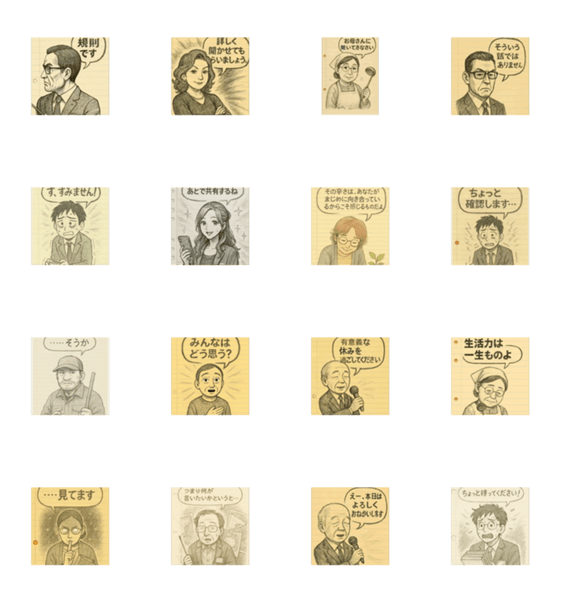 | スタンプ説明 | ノートの落書き世界に住む先生たち。厳しい教頭、個性派教師、新任先生や用務員まで勢ぞろい。リアル寄り手描き風の静かな表情とクセになる一言が魅力。 教師,先生,学校 |