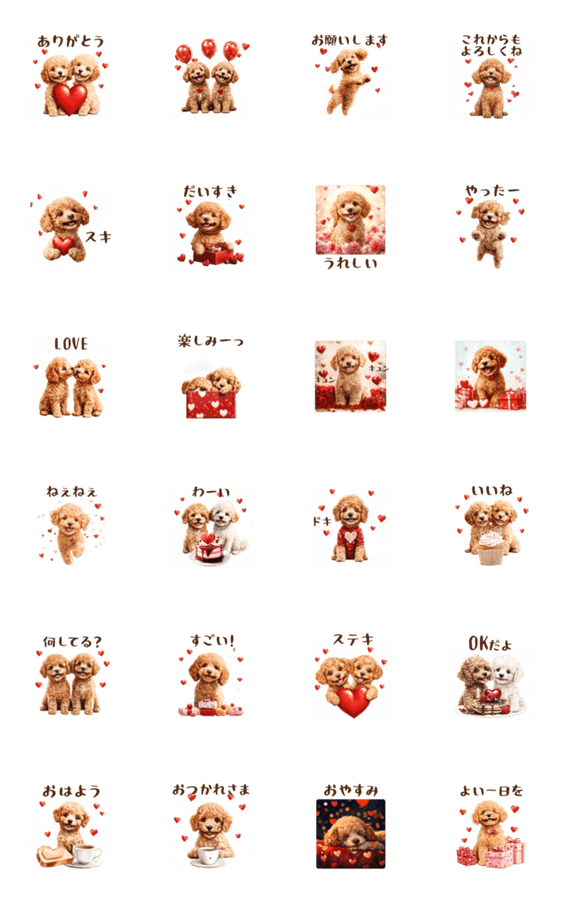 | スタンプ説明 | 動く♡子犬トイプードルの気持ちを伝えるハートいっぱいアニメーション・スタンプ。 バレンタイン・ホワイトデーにも使えます♡ |
