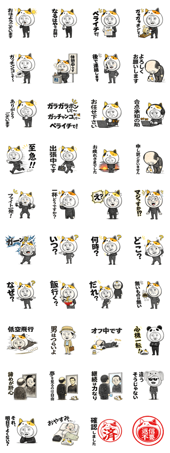 | スタンプ説明 | 仕事のやりとりにちょうどいい、 猫おじさんのスタンプ第2弾。 ビジネスでも日常でも使いやすい言葉を揃えました。 今日も生きてる。それで十分。 |