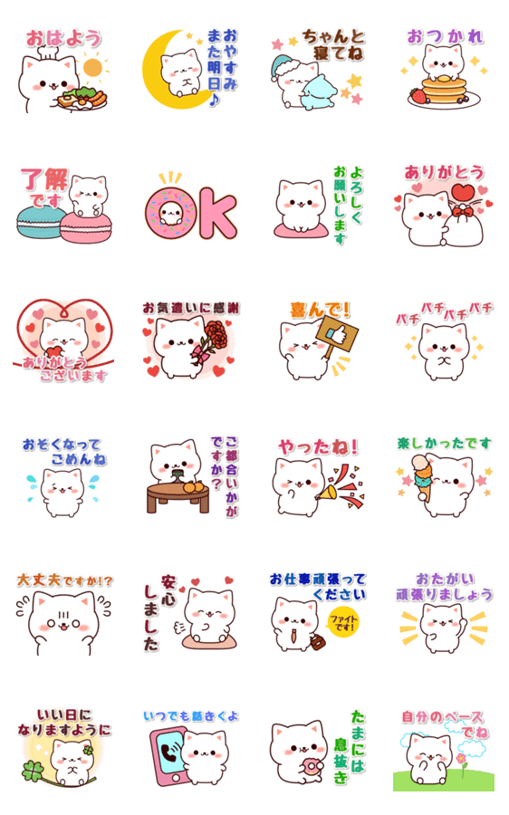 毎日使いやすい、気づかいのフレーズが入ったマシュマロみたいな白猫のスタンプです♪
