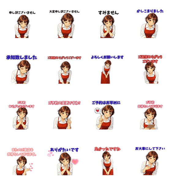 | スタンプ説明 | 赤いエプロンシリーズのベテランお姉さん編!エステ、リラク、ヘア、まつ毛、ネイルサロン等のオーナーやstaffがお客様へお詫びや返信のメッセージに。様々なサービス業に。 |