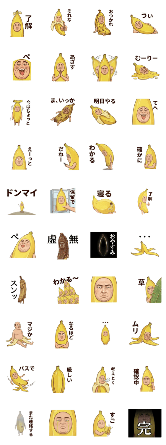 | スタンプ説明 | 人生も会話も、皮を被ってやり過ごす。熟れすぎた大人のための、感情省エネスタンプ。返信が面倒な時、言葉に詰まった時、このバナナが全てを濁します。 |