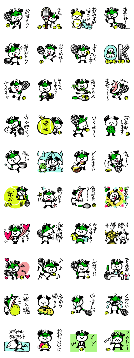 パンダはテニスを継続中。グリップを緑に変えて気分一新!(絵と文字に白ふち付き)