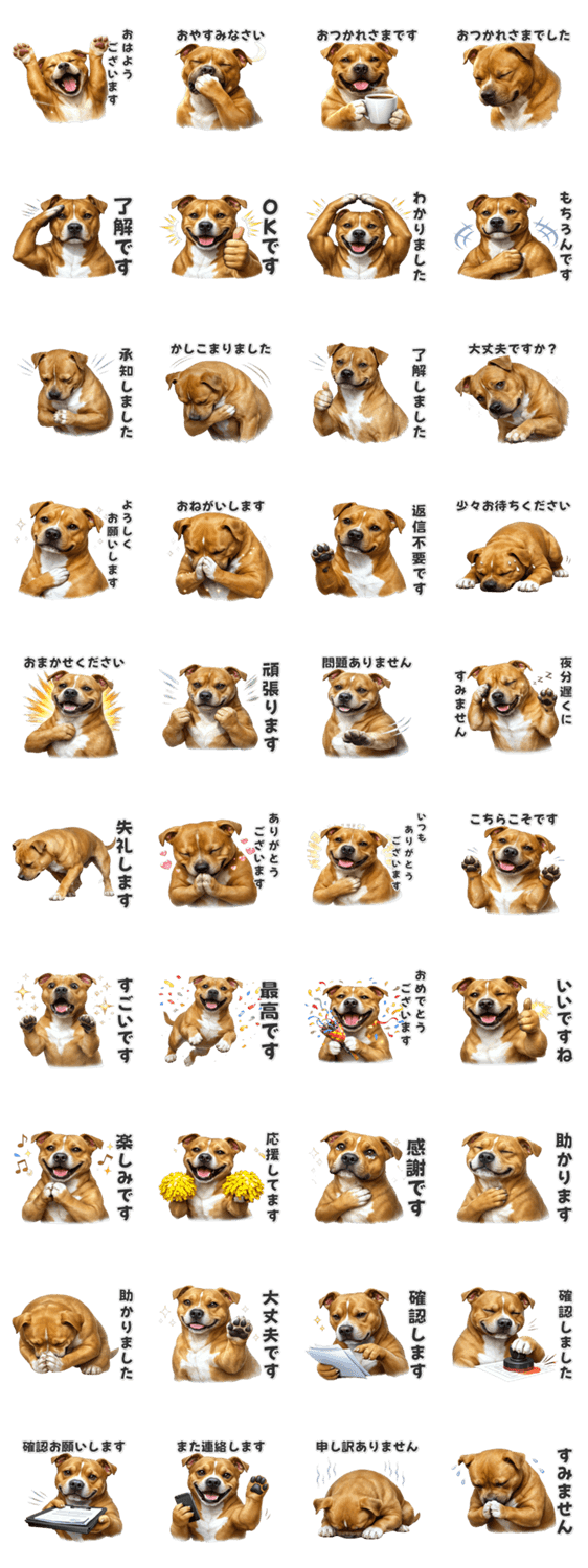 | スタンプ説明 | 表情豊かなピットブルの毎日使えるスタンプです。/かわいい/シンプル/日常/挨拶/動物/癒し/友達/家族/見やすい/便利/ゆるかわ/返事/よく使う/可愛い |
