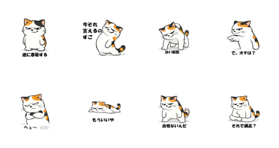 | スタンプ説明 | ふてぶてしくて生意気な三毛猫が、 無言圧・皮肉・毒のある一言で会話を制します。 使い勝手抜群の大人向けスタンプ。 |