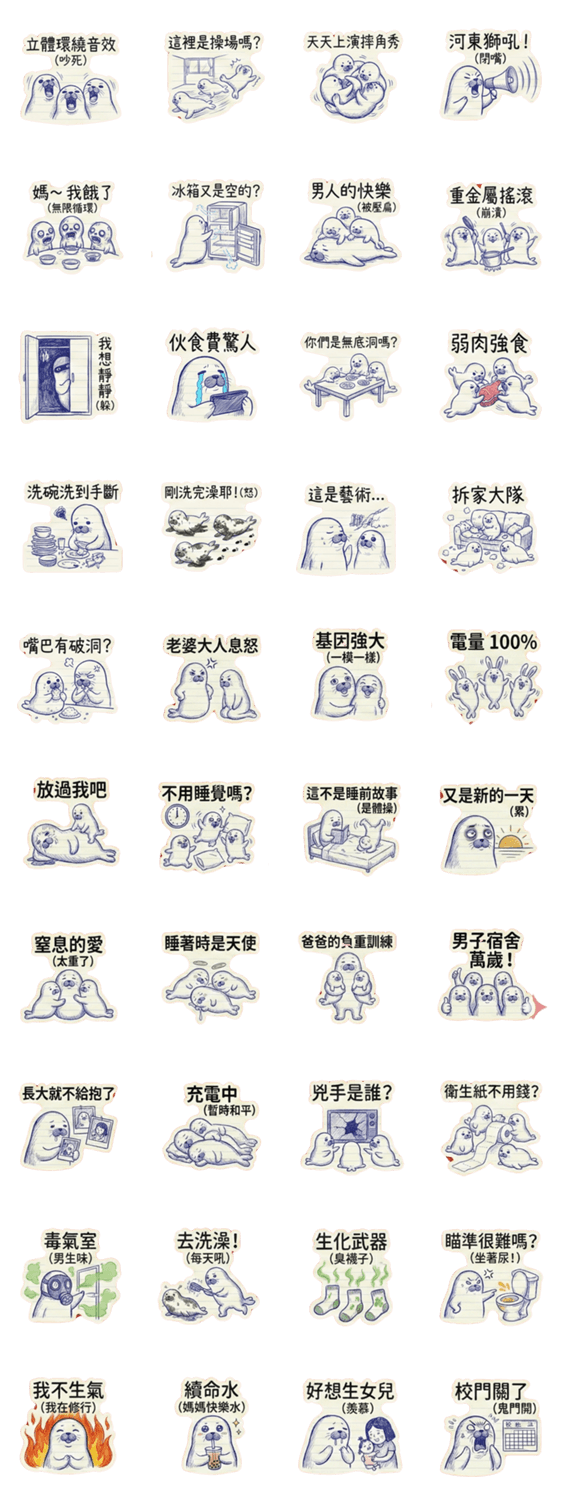 | スタンプ説明 | Life in a house full of boys! Featuring the exhausted Mom Seal, the childish Dad Seal, and three energetic Baby Seals. |
