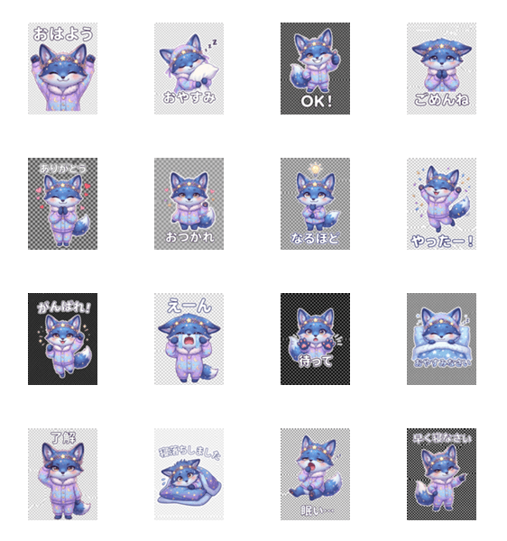 | スタンプ説明 | A sleepy fox in starry pajamas. Perfect for daily chats from good morning to good night. Sweet dreams! |