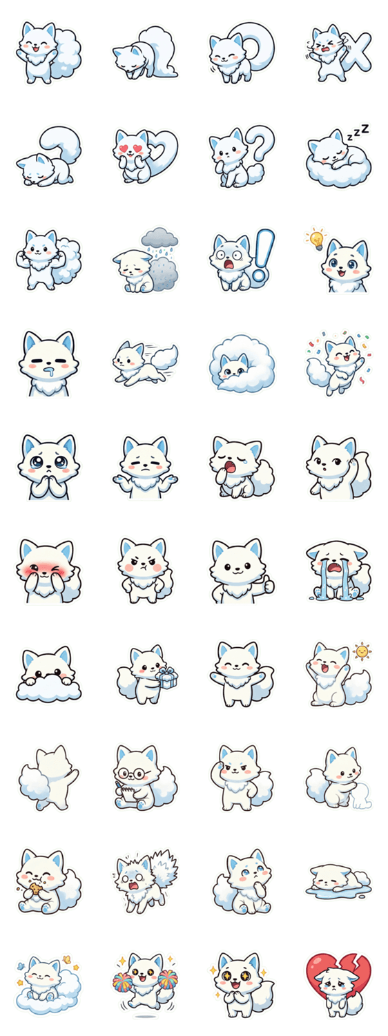 | スタンプ説明 | 優しい雲の子「フーフー」があなたのトークタイムに寄り添います。感情豊かなしっぽと可愛い表情が、言葉がなくても温かい気持ちを伝えます。 |