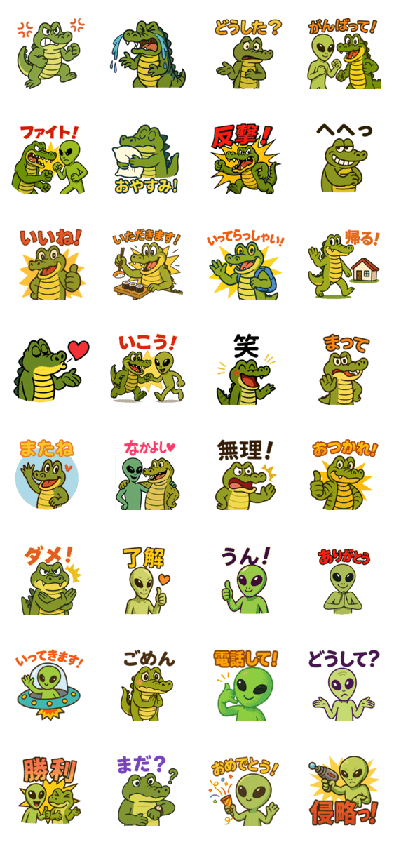 | スタンプ説明 | レトロSF風の宇宙人とワニのスタンプセットです。 表情やリアクションに使いやすいスタンプが揃っています。 Retro sci-fi alien vs alligator sticker set. |
