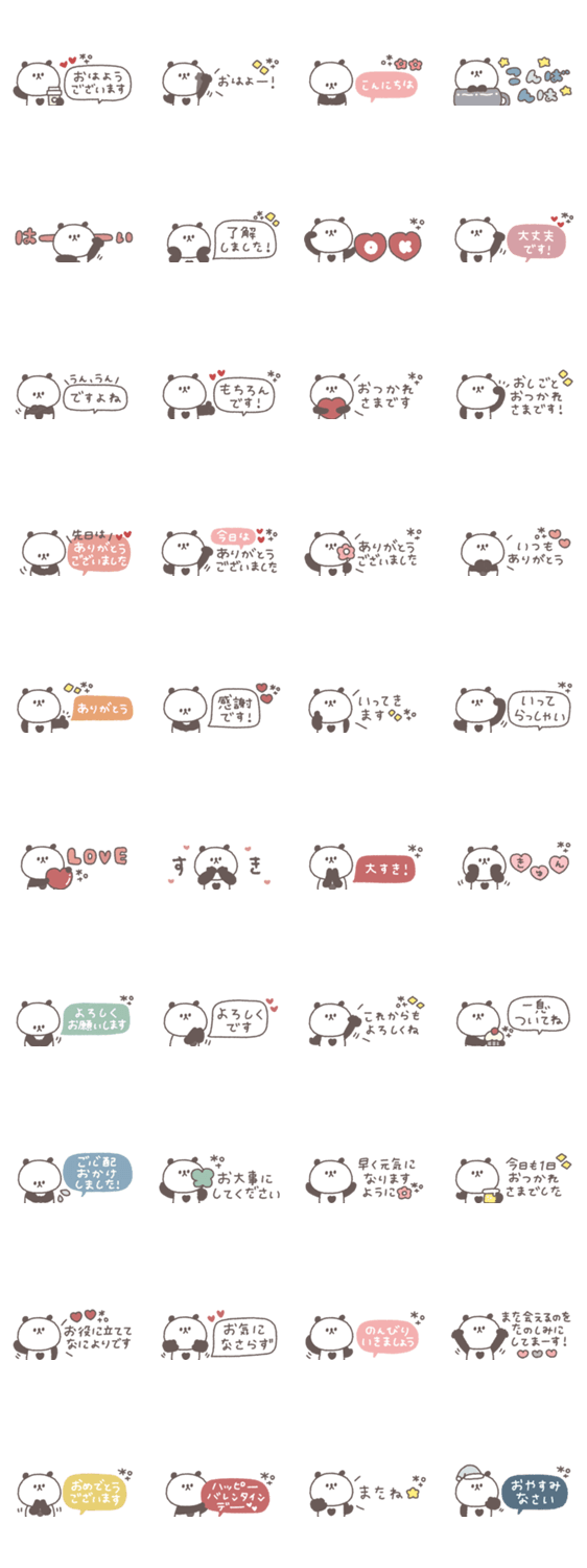 | スタンプ説明 | 一つあると便利な小さくてかわいいぱんだのスタンプです。 パンダ/大人可愛い/シンプル/あいさつ/吹き出し/くすみカラー |