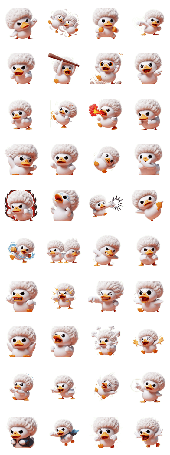 | スタンプ説明 | モフモフのアフロがトレードマークのコールダックが、ついに怒りの限界突破!プンプン怒る姿から、大激怒、もう許せない!という感情まで、このスタンプで可愛くコミカルに |