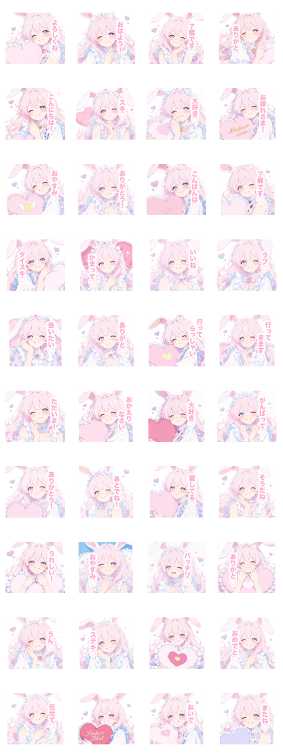 | スタンプ説明 | かわいい/可愛い/ミニキャラ/あざとい/パステル/うさ耳/うさぎ/美少女/女の子/女子/量産型/地雷系/ピンク/ハート/癒し/挨拶/日常/毎日使える/ガーリー/ファンシー/ピンク髪 |