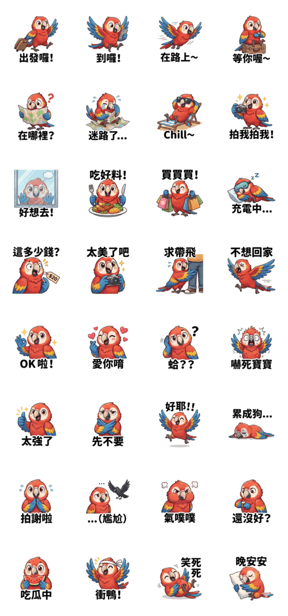 | スタンプ説明 | Travel with ChuTrip the adventure parrot! From departure to arrival, food, fun, and travel moments, perfect stickers for every journey and daily chats. |