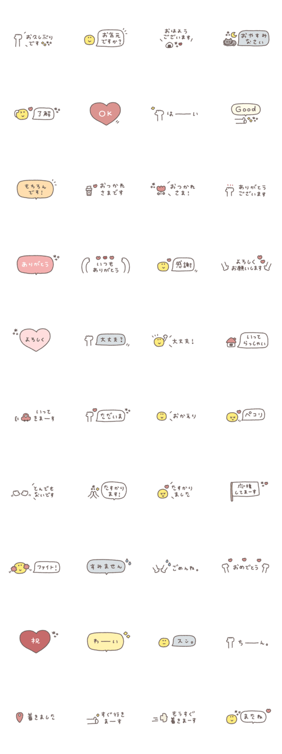 | スタンプ説明 | 一つあると便利!シンプルなあいさつスタンプです。 細字/シンプル/大人可愛い/あいさつ/スマイル/手書き/くすみカラー |