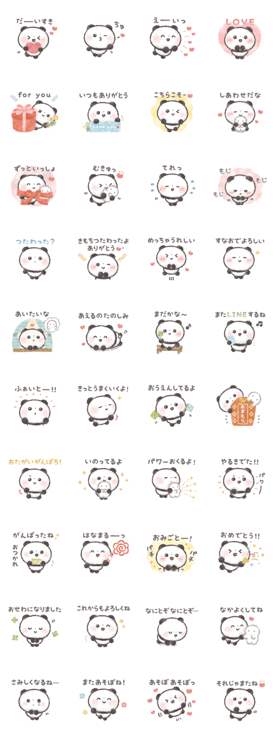 | スタンプ説明 | 好き、ありがとう、がんばってね、など大切な想いをぽてころぱんだがやさしく届けます。日常にも特別な日にも使いやすい、気持ちを伝えるスタンプです。バレンタインにも♪ |