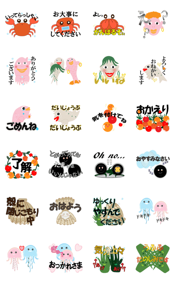 | スタンプ説明 | カニさんイクラさんクラゲさんお魚さん2匹。ウニ、ホタテ。一生懸命さを感じる海のキャラクターです。コミュニケーションを大切な人に |