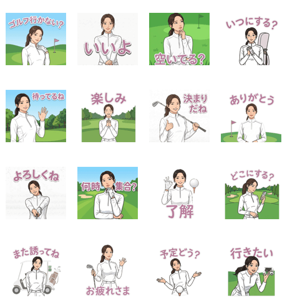 | スタンプ説明 | ゴルフ好きな友達との誘い・計画に使えるスタンプ。 白ゴルフウェアの女性キャラが優しい雰囲気で「ゴルフ行かない?」「予定どう?」などラウンド計画をサポート! |