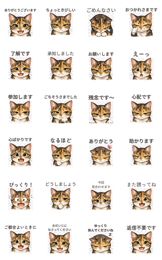 | スタンプ説明 | やさしい表情のねこスタンプです。年上の方やお仕事のやりとりにも使いやすくしています。文字くっきりみやすく。毎日のトークにそっと寄り添うスタンプです改良版 |