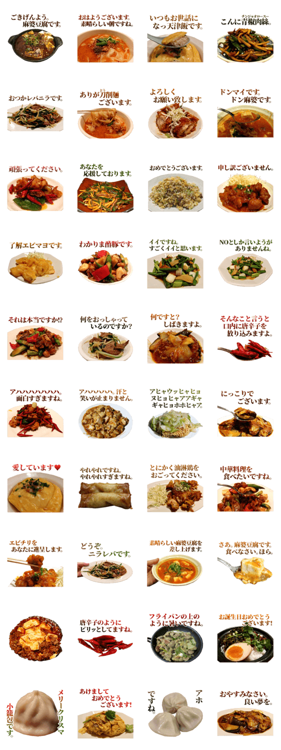 | スタンプ説明 | 敬語を使う中華料理のスタンプです。刀削麺,唐辛子,小籠包,酢豚,炒め,麻婆豆腐,魯肉飯,青椒肉絲,レバニラ。あけおめお正月クリスマス。一年中毎日使える丁寧語。実写。 |