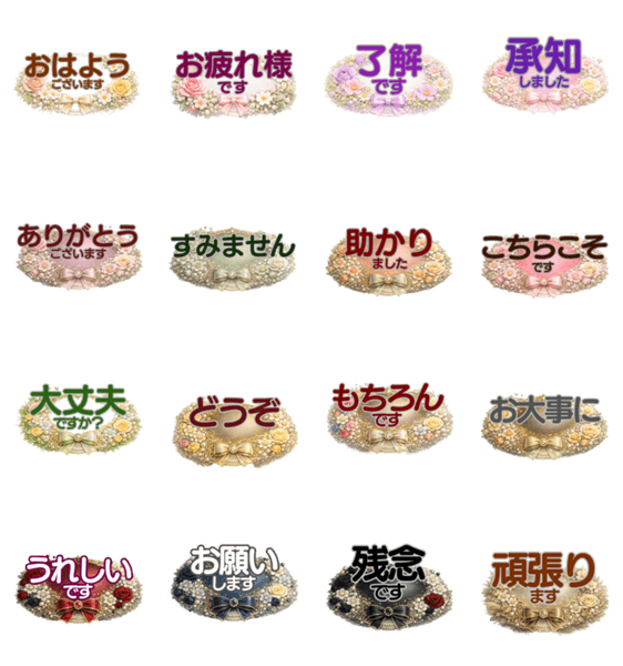 | スタンプ説明 | シックなのに華やかなお花フレームでのごあいさつスタンプです。取り急ぎ返事をするのにピッタリです。かたすぎず、くだけすぎず。 |